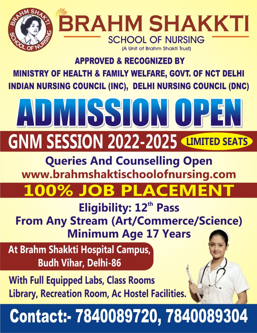 Brahm Shakti School of Nursing (BSSoN) is approved and recognized by the Indian Nursing Council (INC), Delhi Nursing Council (DNC), The Dept. of health and family Welfare, Govt. of NCT of Delhi.