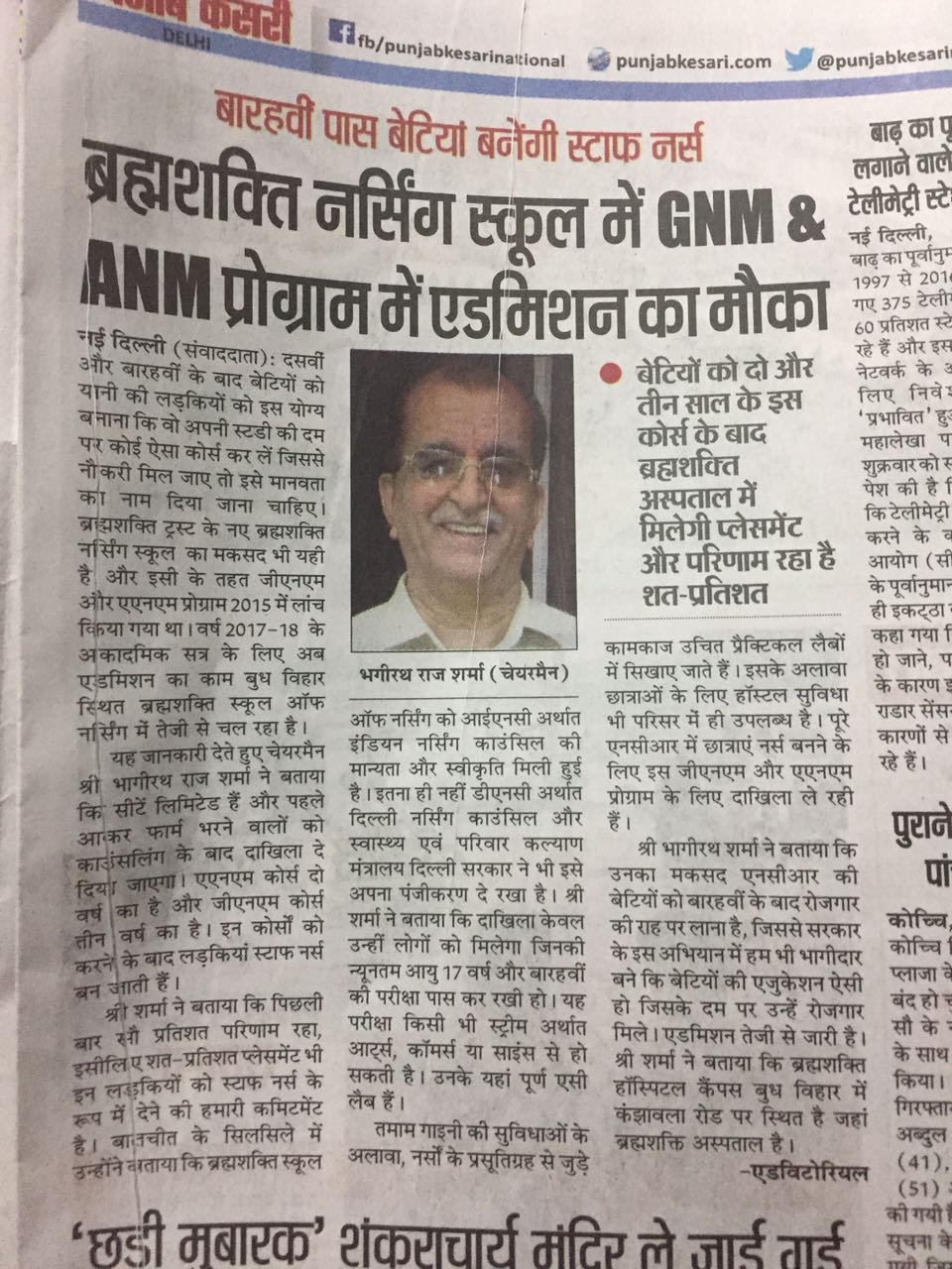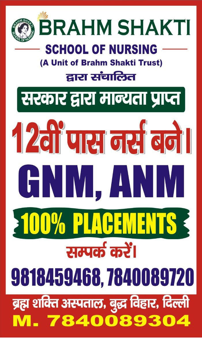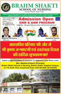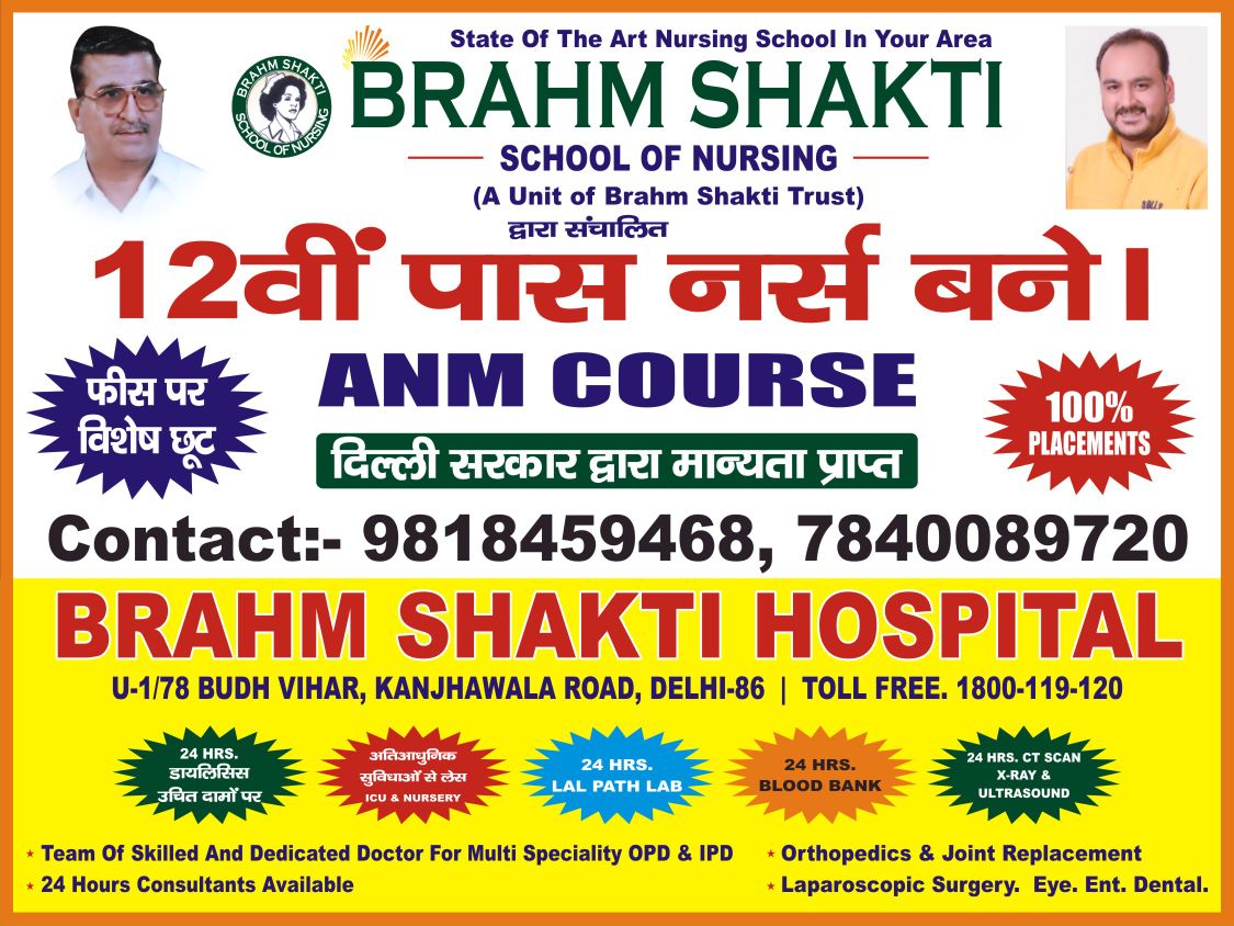 Brahm Shakti School of Nursing is an educational unit of the Brahm Shakti Trust. The State of the art School of nursing is located in Budh Vihar, North West Delhi, within the hundred bedded, multi-specialty Brahm Shakti Hospital Campus, bearing address U-1/78 Main kanjhawala Road Budh Vihar Delhi 110086. This hospital and the school is a famous and well known landmark of this side of Delhi.
